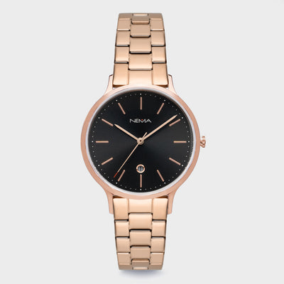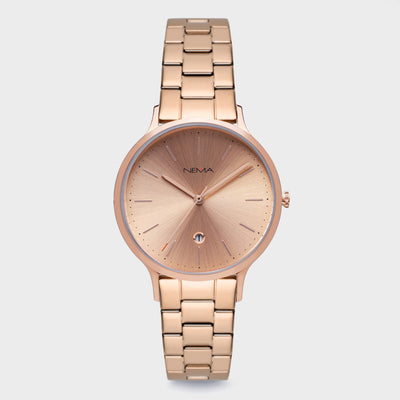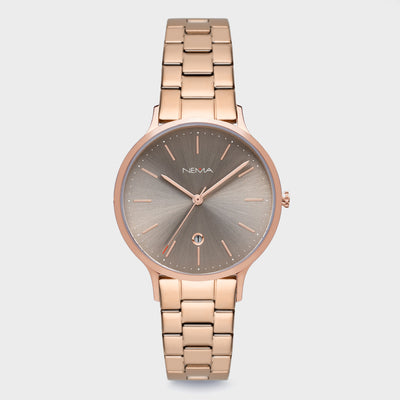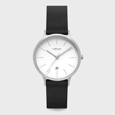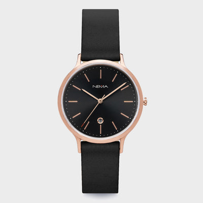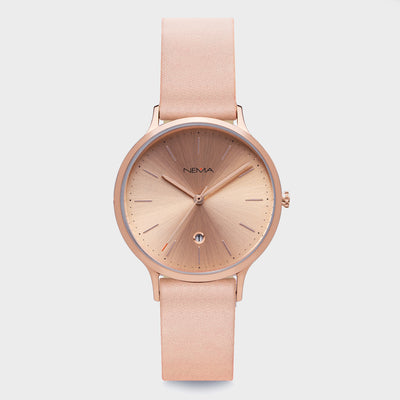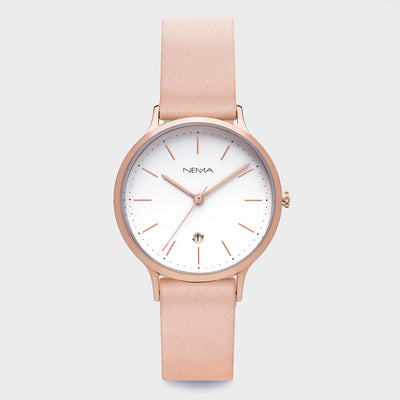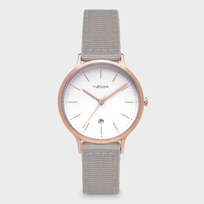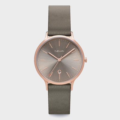 DescriptionSophisticated and refined. Arlo is our first watch featuring a date function, stylishly set in a diamond cut window on the dial. Each hour is marked by thin metallic marking with a rose gold finish and decorated with minimal printed dots. This watch features a chic 16 mm high-quality soft grey unstitched leather strap. As with all our NEMA watches, our Arlo collection is easily interchangeable with any other NEMA watch straps of the same size.